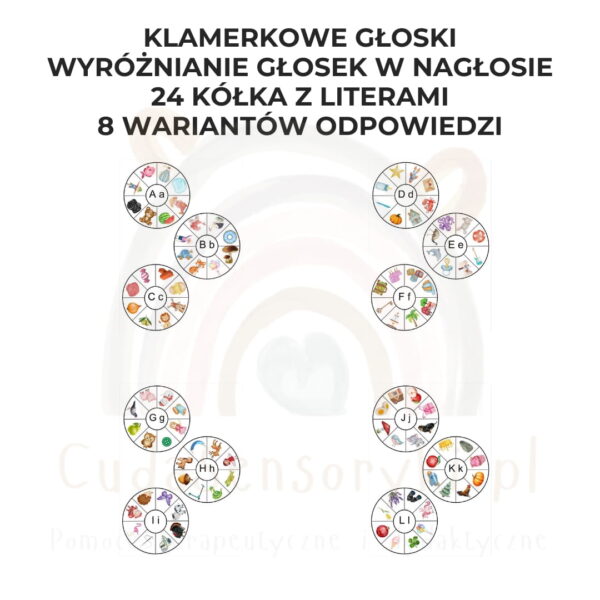 Zabawa klamerkowa z głoskami w nagłosie to świetny sposób na naukę liter i rozwijanie słuchu fonemowego. Zestaw zawiera 24 kółka z literami, a zadaniem dziecka jest zaznaczenie klamerką trzech obrazków rozpoczynających się daną głoską.