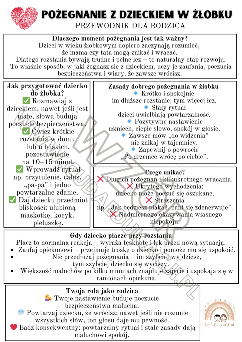 Rozstania nigdy nie są łatwe – ani dla dziecka, ani dla rodzica. Dlatego stworzyliśmy praktyczną broszurę, która pomoże Ci przygotować się do pożegnania w żłobku, przedszkolu i szkole. To zestaw trzech materiałów w formie PDF, które możesz wydrukować i przekazać rodzicom w placówce lub czytać online. 📂 Co znajdziesz w broszurach? Pożegnanie w żłobku –…