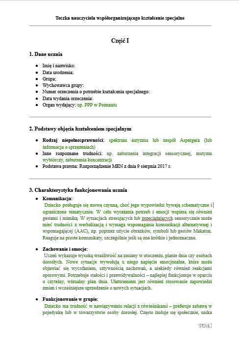 📘 Teczka nauczyciela współorganizującego kształcenie specjalne Uczeń ze spektrum autyzmu i Zespołem Aspergera – pliki do edycji Word Kompletny zestaw dokumentów wspierający codzienną pracę nauczyciela współorganizującego edukację uczniów posiadających orzeczenie ze względu na spektrum autyzmu lub Zespół Aspergera. Wszystkie pliki są edytowalne w formacie Word – gotowe do druku lub personalizacji zgodnie z realiami danej…