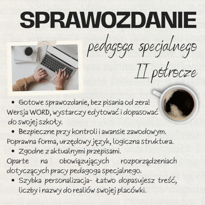📄 Gotowe sprawozdanie z pracy pedagoga specjalnego za II półrocze to praktyczny, edytowalny dokument Word, który pomaga szybko i profesjonalnie podsumować cały rok szkolny. Zawiera gotową strukturę, urzędowy język oraz miejsce na opis działań, efektów pracy i wniosków do dalszej realizacji.