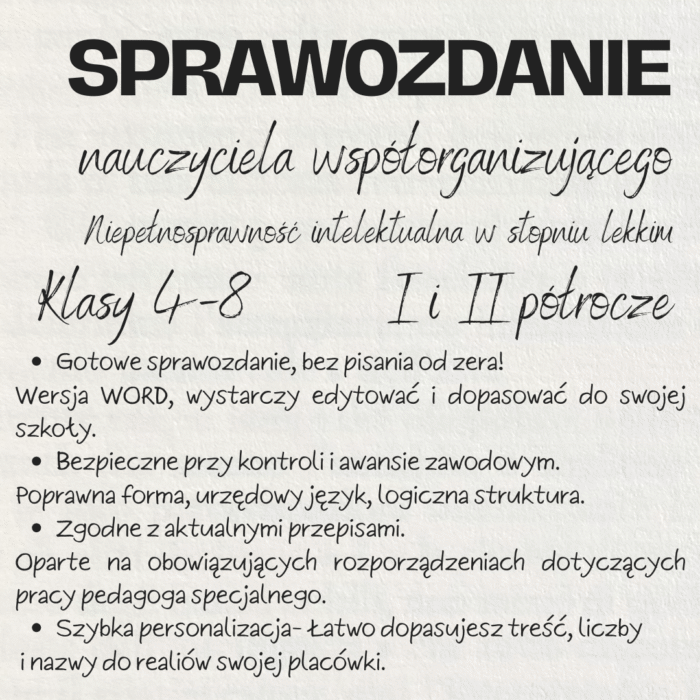 📄 Gotowe sprawozdanie nauczyciela współorganizującego kształcenie specjalne dla klas IV–VIII, przygotowane z myślą o uczniach z niepełnosprawnością intelektualną w stopniu lekkim. Dokument zawiera komplet materiałów na I i II półrocze, jest napisany urzędowym językiem i w pełni edytowalny w pliku Word.