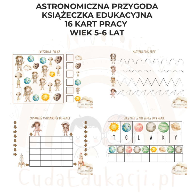 „Astronomiczna przygoda” – rakieta do świata nauki dla Twojego przedszkolaka! Czy Twoje dziecko ma 5-6 lat i uwielbia kosmos? Chcesz, aby rozwijało się poprzez zabawę i kreatywne zadania? „Astronomiczna przygoda” to idealne rozwiązanie! Ten wyjątkowy zestaw 16 kart pracy w formacie PDF to doskonała okazja, aby Twoje dziecko mogło rozwijać swoje umiejętności w radosny sposób. Zadania są starannie zaprojektowane, aby…
