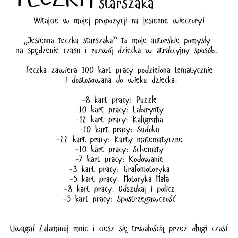 Zestaw 4 sezonowych „Teczek Starszaka” (6–7 lat) – 400 kart pracy PDF Kup 4 książeczki w cenie 3 – jedna GRATIS! Szukasz kreatywnych, edukacyjnych materiałów na cały rok dla dziecka w wieku 6–7 lat?Zestaw czterech „Teczek Starszaka” to aż 400 stron kart pracy PDF, które rozwijają logiczne myślenie, motorykę małą, grafomotorykę, kodowanie i umiejętności matematyczne…