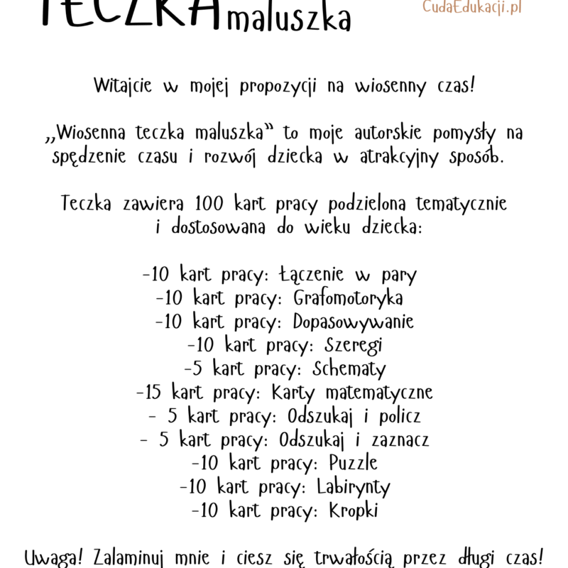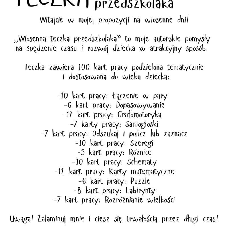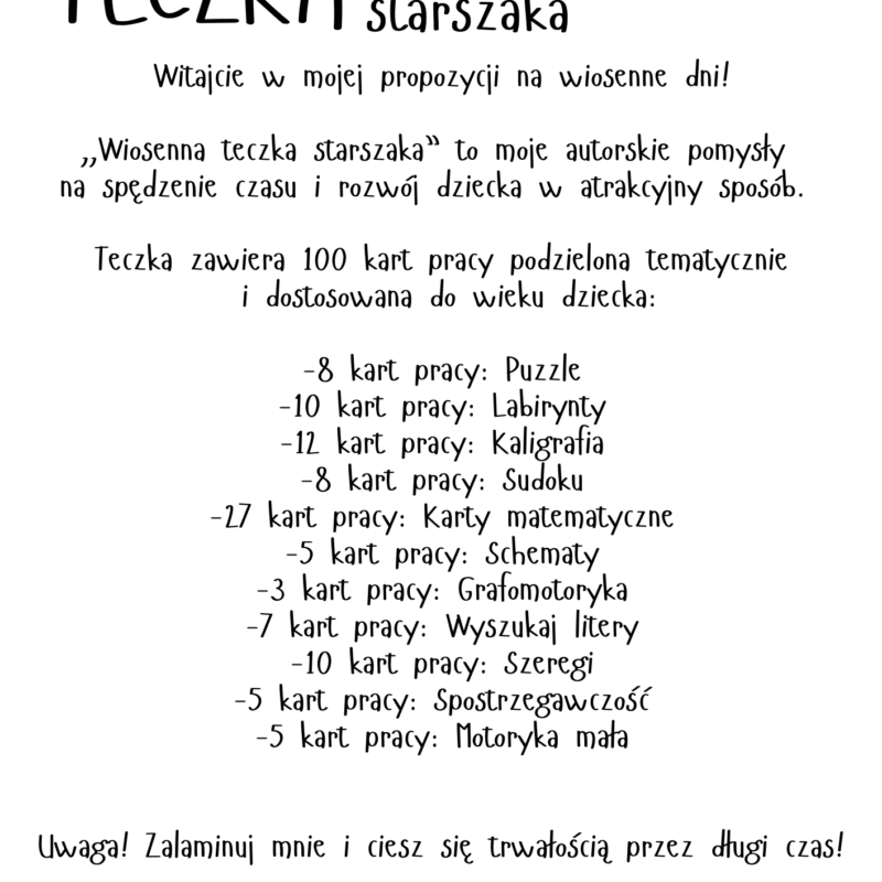 🌷 Wiosenna Teczka Przedszkolaka – 100 stron PDF dla dzieci 4–5 lat Wprowadź wiosenny klimat do codziennych aktywności Twojego dziecka!Wiosenna Teczka Przedszkolaka to aż 100 stron różnorodnych kart pracy w formacie PDF – stworzonych z myślą o przedszkolakach w wieku 4–5 lat. Materiały zostały zaprojektowane przez pedagoga specjalnego, z uwzględnieniem rozwoju poznawczego, grafomotoryki, logicznego myślenia…