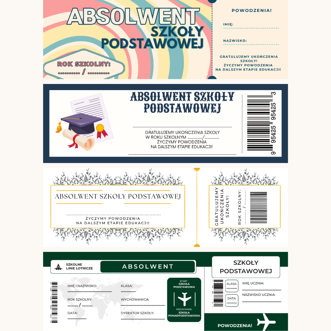 - Bilety dla absolwentów szkoły podstawowej: Eleganckie bilety dla absolwentów, którzy kończą ważny etap edukacji.