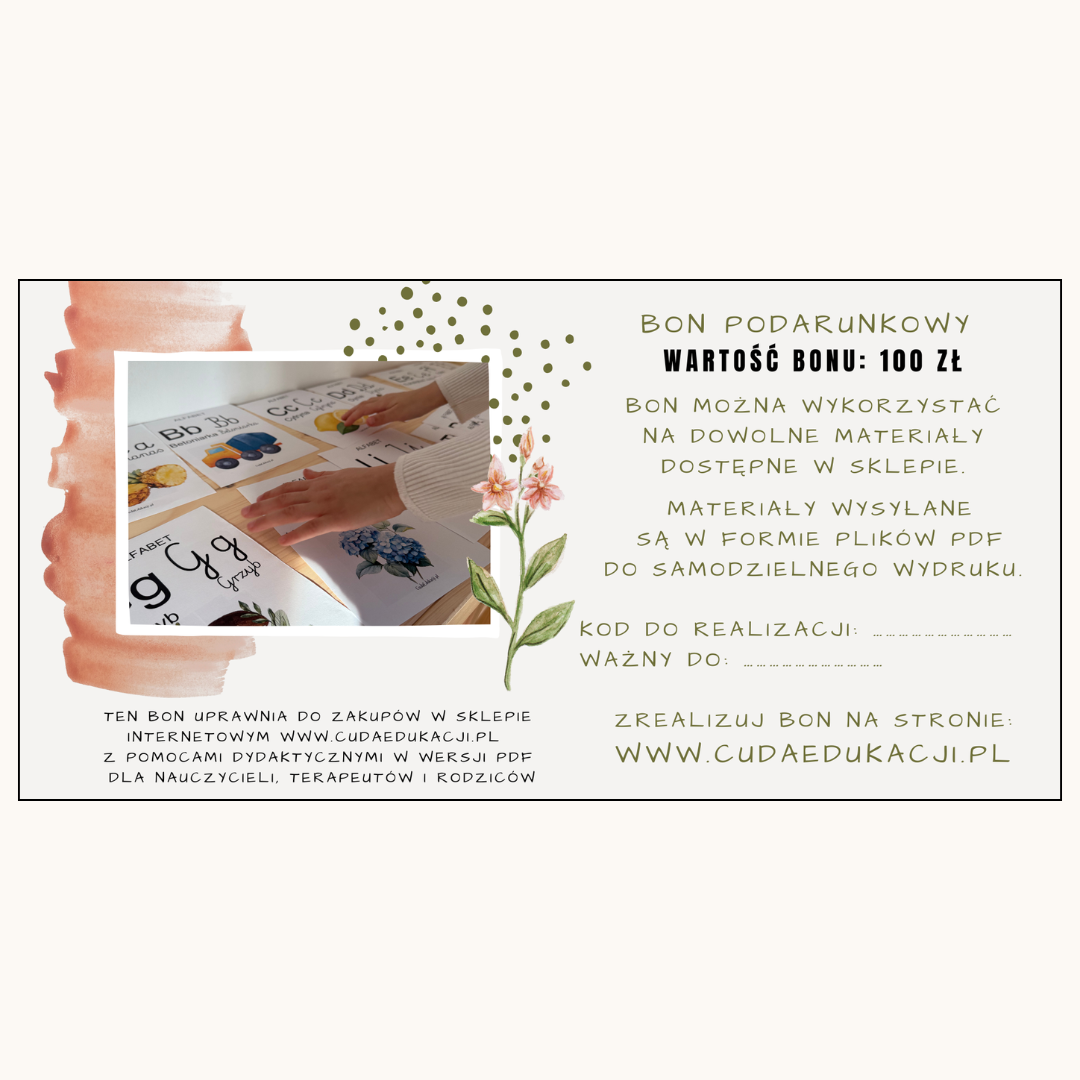 Bon podarunkowy 100 zł do sklepu CudaEdukacji.pl to praktyczny prezent dla nauczyciela, terapeuty lub rodzica, który daje dostęp do sprawdzonych materiałów edukacyjnych w formie plików PDF do samodzielnego wydruku.