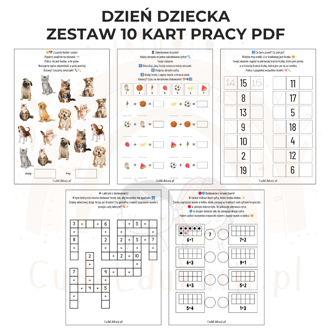 Z okazji Dnia Dziecka przygotowaliśmy wyjątkowy zestaw 10 różnorodnych kart pracy PDF do samodzielnego wydruku. Zawarte w nim zadania rozwijają logiczne myślenie, percepcję wzrokową, sprawność manualną oraz umiejętności matematyczne – wszystko w formie angażującej zabawy!