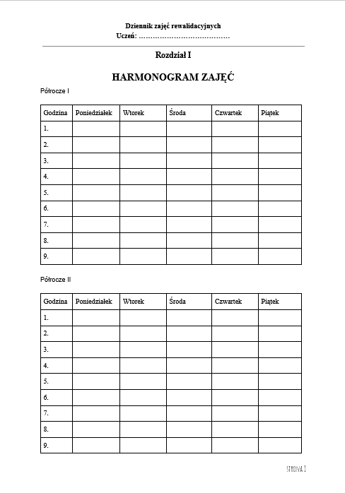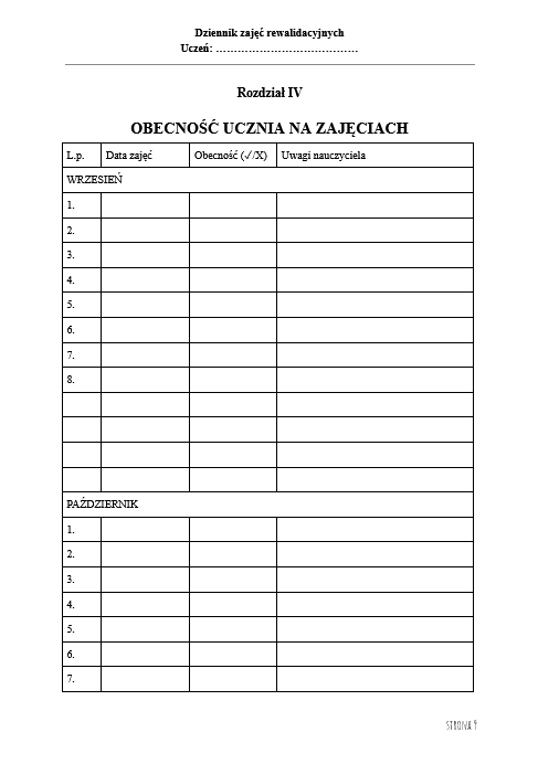 gotowe wzory: harmonogram, dane ucznia, indywidualny program pracy, obecności, opis zajęć, ocena postępów, obserwacja, notatki