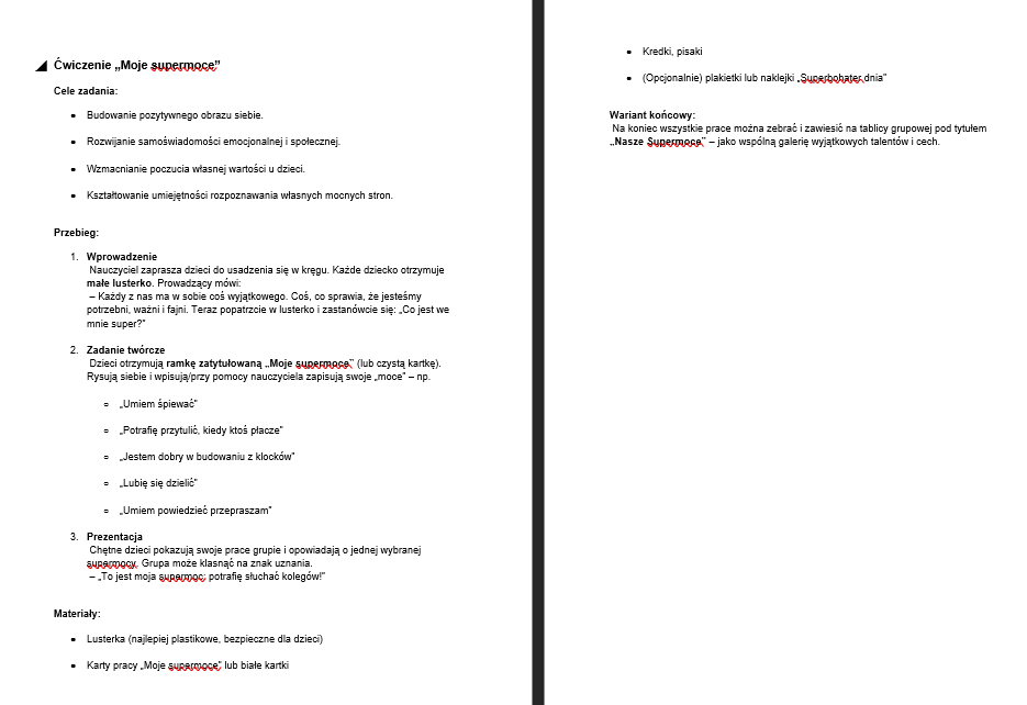 ✔️ Ćwiczenia i gry: „Słoik radości”, „Serce empatii”, „Lustro komplementów”, „W cudzych butach” i inne