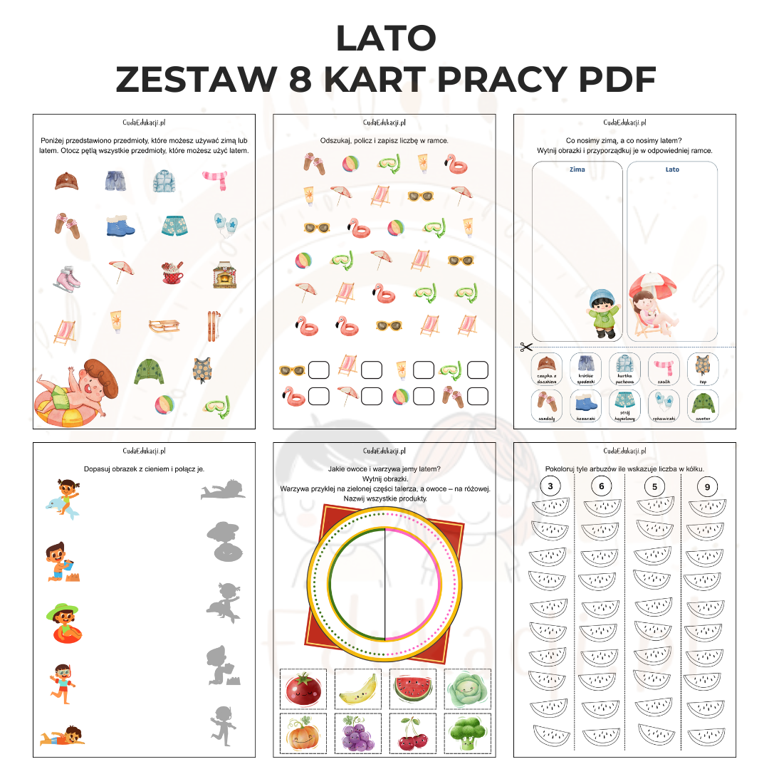 Ten kolorowy zestaw kart pracy do samodzielnego wydruku (PDF) to doskonały sposób na letnią aktywność edukacyjną dla dzieci w wieku 3–6 lat. Przygotowany z myślą o przedszkolakach i dzieciach z klas zerowych, rozwija kluczowe umiejętności w formie przyjemnej, wakacyjnej zabawy.