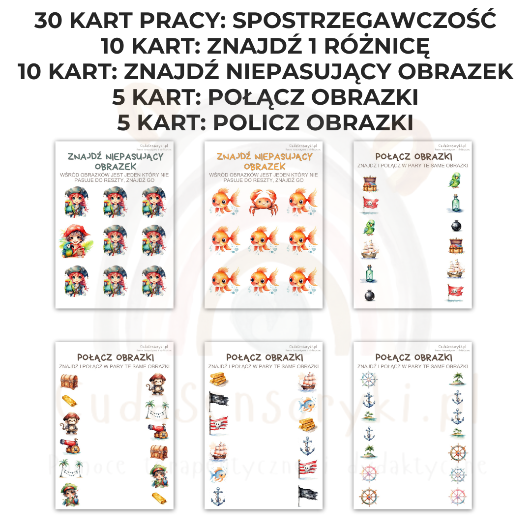 Nasze karty pracy w pirackim stylu zawierają ćwiczenia na spostrzegawczość, które doskonale rozwijają umiejętności wizualne oraz umożliwiają skupienie uwagi dziecka.