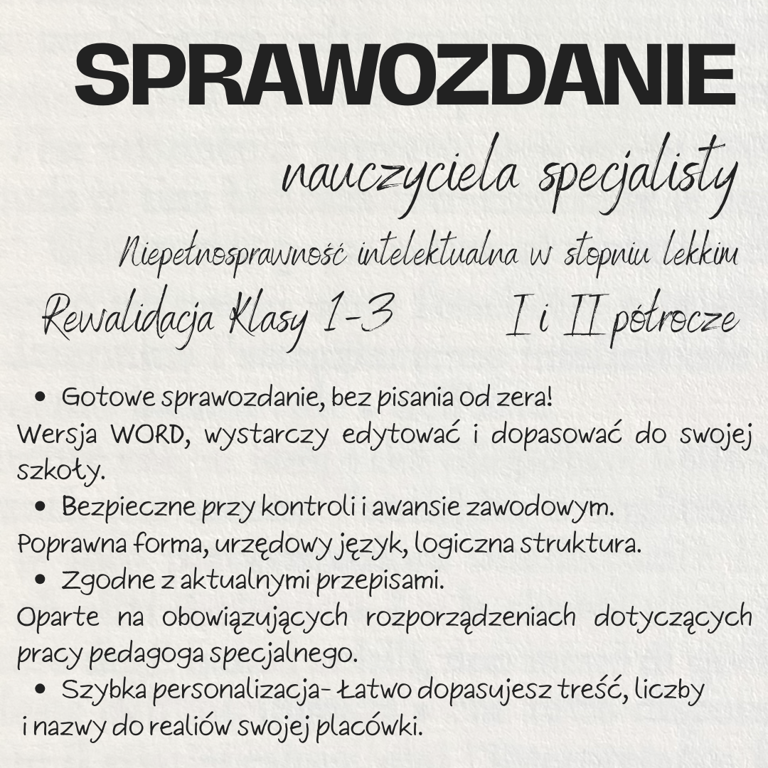 Gotowe sprawozdanie nauczyciela specjalisty prowadzącego indywidualne zajęcia rewalidacyjne przeznaczone dla uczniów klas I–III szkoły podstawowej z orzeczeniem o potrzebie kształcenia specjalnego wydanym ze względu na niepełnosprawność intelektualną w stopniu lekkim.