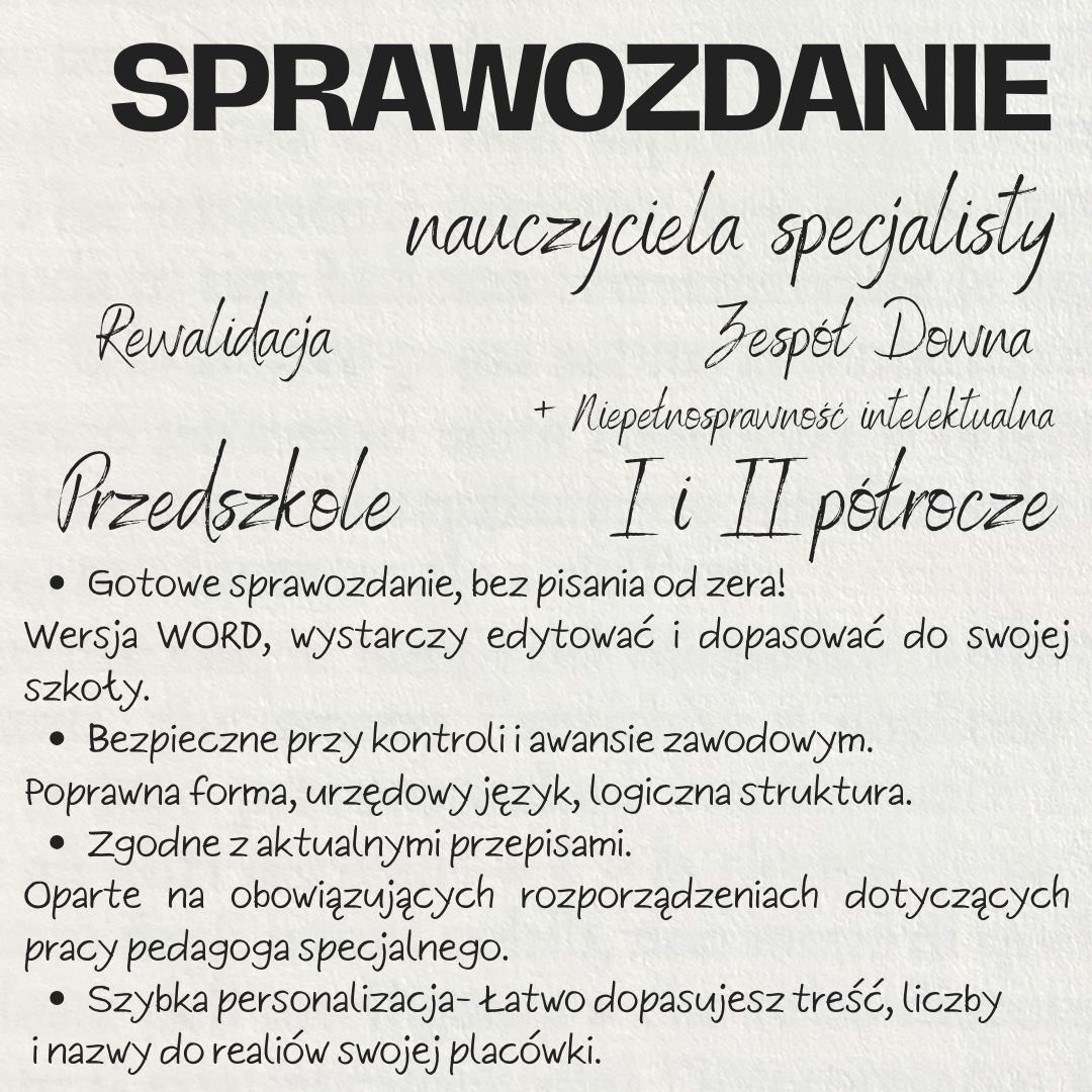 Gotowe sprawozdanie nauczyciela specjalisty prowadzącego zajęcia rewalidacyjne w przedszkolu, opracowane z myślą o dzieciach z zespołem Downa oraz niepełnosprawnością intelektualną w stopniu lekkim.