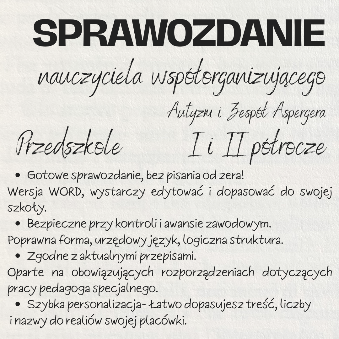 Gotowe, profesjonalne sprawozdanie nauczyciela współorganizującego kształcenie specjalne w przedszkolu, przeznaczone do pracy z dzieckiem posiadającym orzeczenie o potrzebie kształcenia specjalnego ze względu na autyzm (w tym zespół Aspergera).