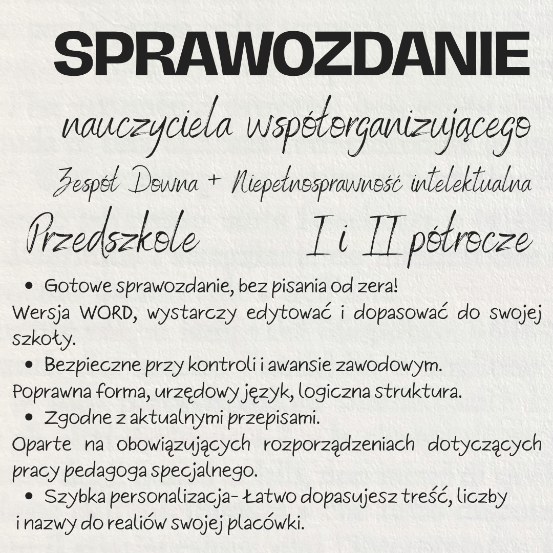 Gotowe, profesjonalne sprawozdanie nauczyciela współorganizującego kształcenie specjalne w przedszkolu, przygotowane specjalnie z myślą o dzieciach z zespołem Downa oraz niepełnosprawnością intelektualną (sprzężenie).