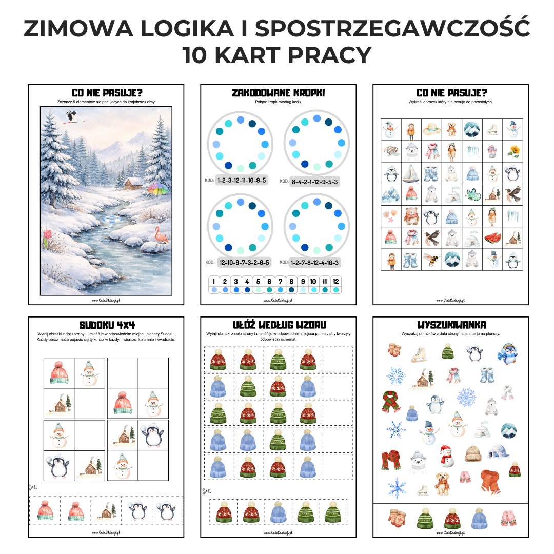 Zimowa logika i spostrzegawczość – zestaw 10 kart pracy PDF